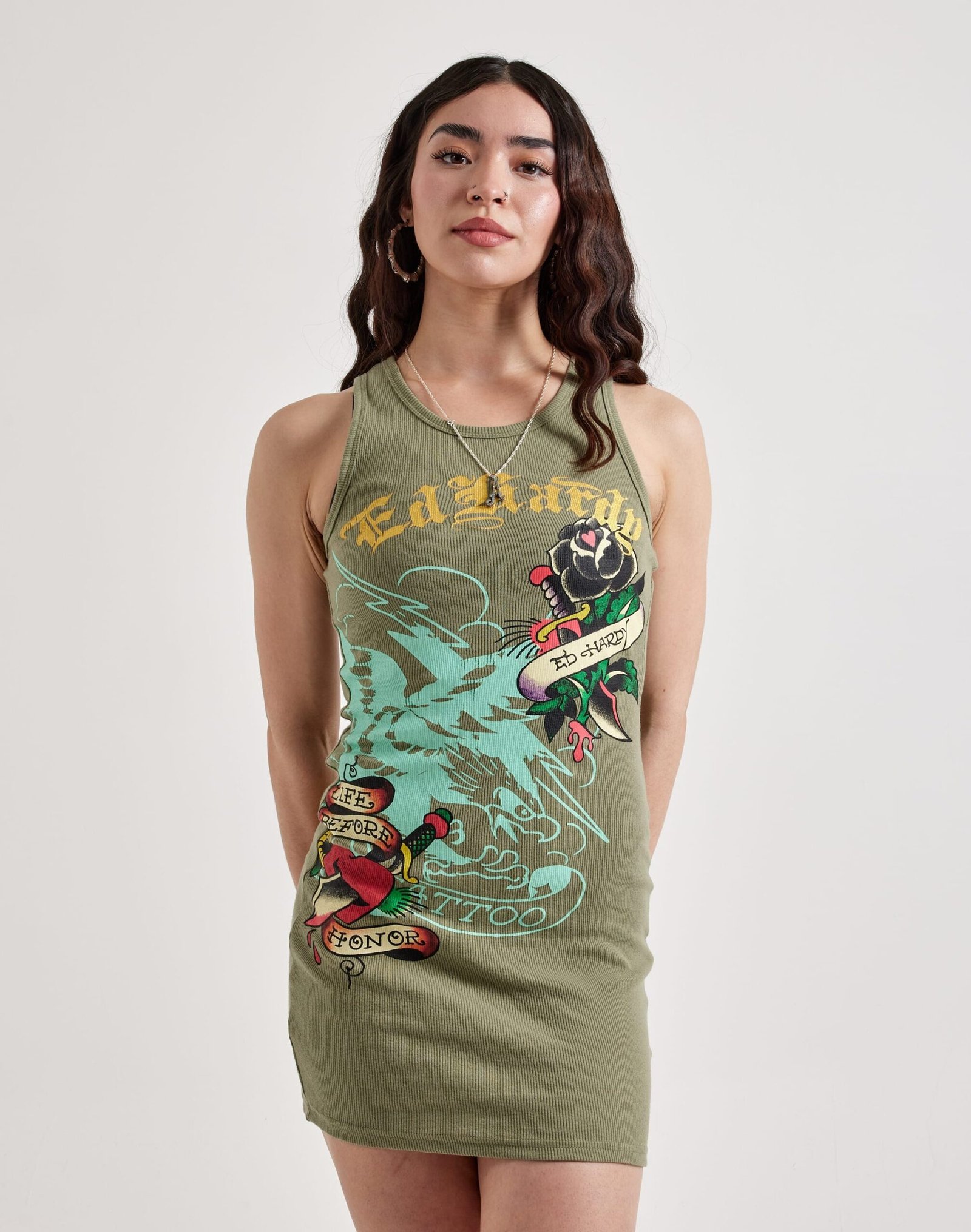 Make a fierce style statement in the Ed Hardy Black Rose Tank Dress, featuring bold tattoo-inspired rose graphics and a sleek, body-skimming fit.