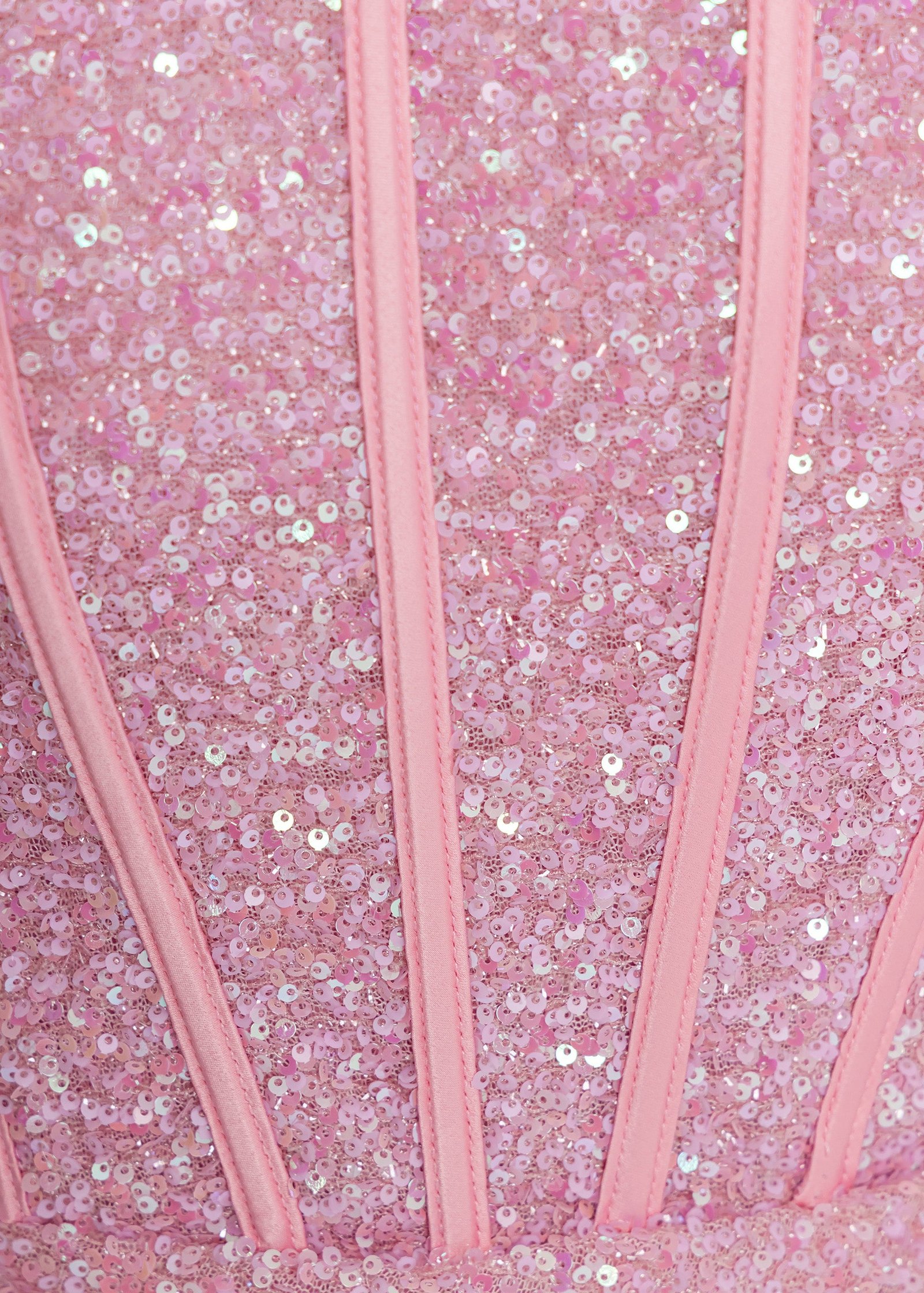 Unleash your inner angel with our stunning Endless Serenade Drape Mini Dress in pink. The corset bodice accentuates your figure while the drape detail adds an elegant touch. The sequin fabric sparkles in the light, making you stand out in any setting. Perfect for making a statement at any special occasion.