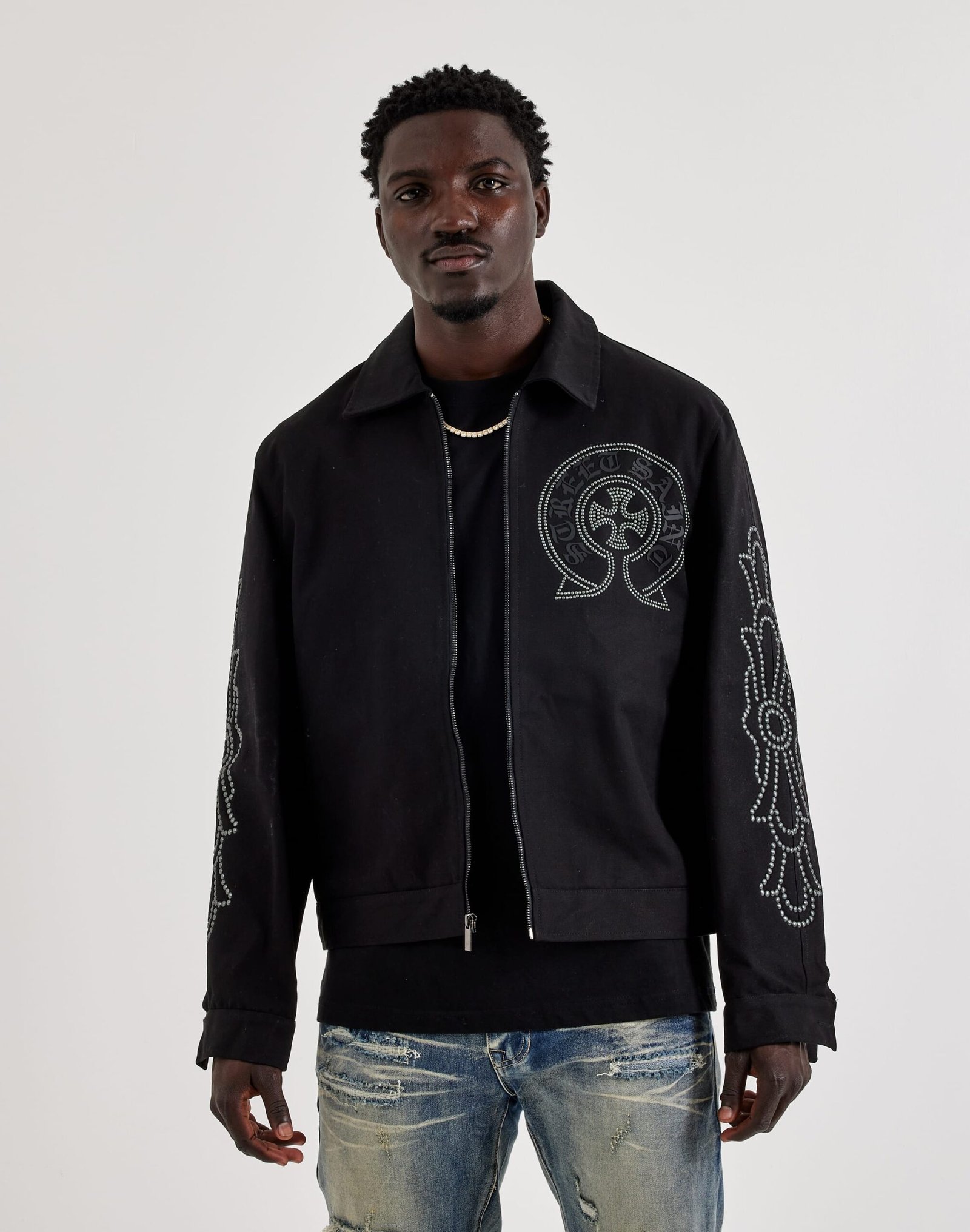 The Roku Studio Street Saint Studded Canvas Jacket fuses bold streetwear energy with a workwear edge. Crafted from durable canvas and detailed with standout stud accents and signature graphics, this work jacket makes every outfit a statement.
