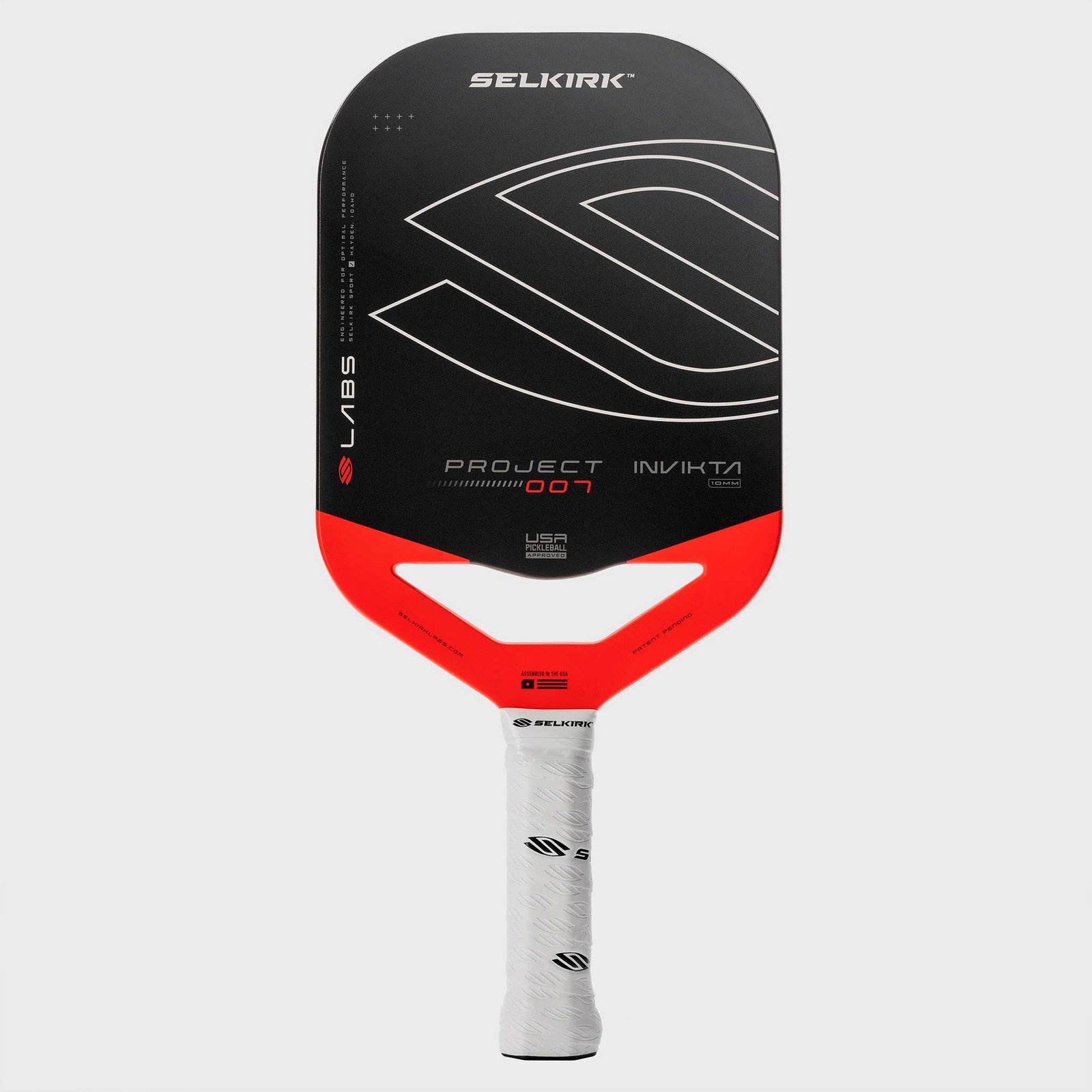 Introducing the Selkirk Labs Project 007 14mm Invikta! This all-court paddle paves the way for durable texture and unbeatable spin. Its 14mm Patent Pending Titanium Mesh System and Florek Carbon Fiber Face provide a larger sweet spot for increased stability and consistency across all shots. Its 14mm core offers impressive control without sacrificing power, giving you the confidence to attack with precision. Enjoy lasting durability from the InfiniGrit Surface, which delivers spin potential of up to 2000 RPMs. Combined with edgeless DuraEdge technology and an updated Air Dynamic Throat design, the Selkirk Labs Project 007 outlasts the competition!