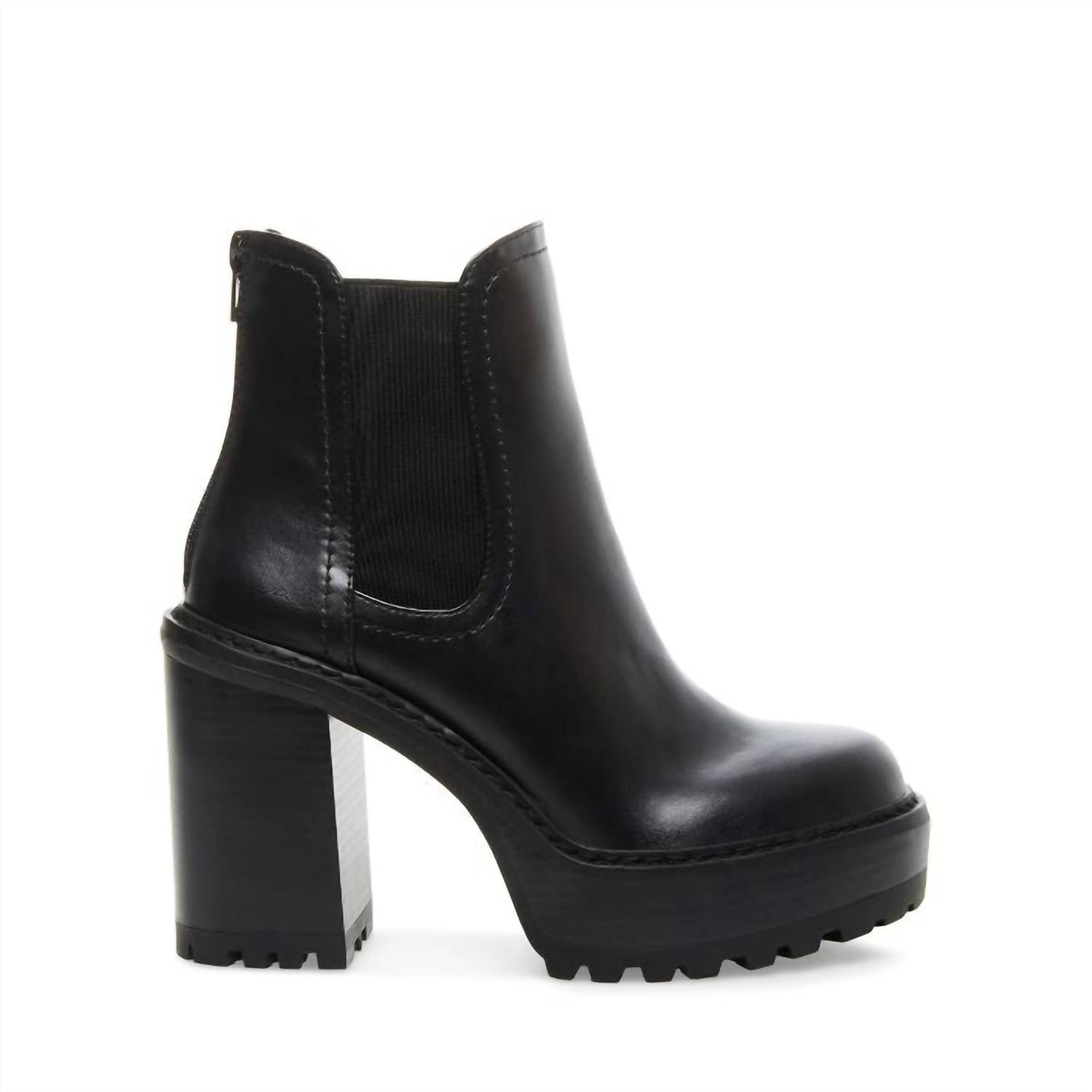 Say hello to the perfect, most versatile boot. The ankle height makes this style easily transition from day to night. Wear them with your favorite skinny jeans and tee for a more laid back look, or pair them with your favorite mini dress and jacket for a night out on the town.Step out in style with the Women’s Lug Sole Stacked Heel Bootie by Steve Madden, designed for contemporary flair. These black ankle boots feature a zipper closure with twin gore sides, a stylish block heel, and a traction lug sole for enhanced grip. The design is completed with a comfortable padded footbed and a modern round toe, making them an excellent choice for evening events. Heel height is 4 inches, with a 1-inch platform, a 4.25-inch shaft, and a 9-inch circumference. Fit: True to size or size up by 0.5 for the perfect fit.